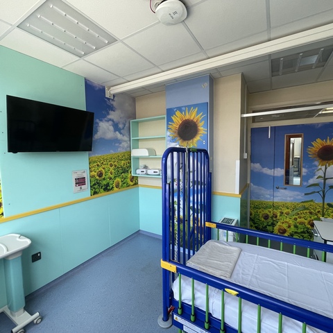 In 2024 we carried out a £19,000 transformation of ‘cubicle 2’, an individual bedroom on the ward. We have replaced the tired magnolia walls with beautiful bright sunflowers, bespoke paneling, a new TV, blinds and comfy chair-bed for parents to stay over night. Every aspect of the room has to meet the strict specifications of the hospital. This is the fourth cubicle we have transformed in the last six years.
